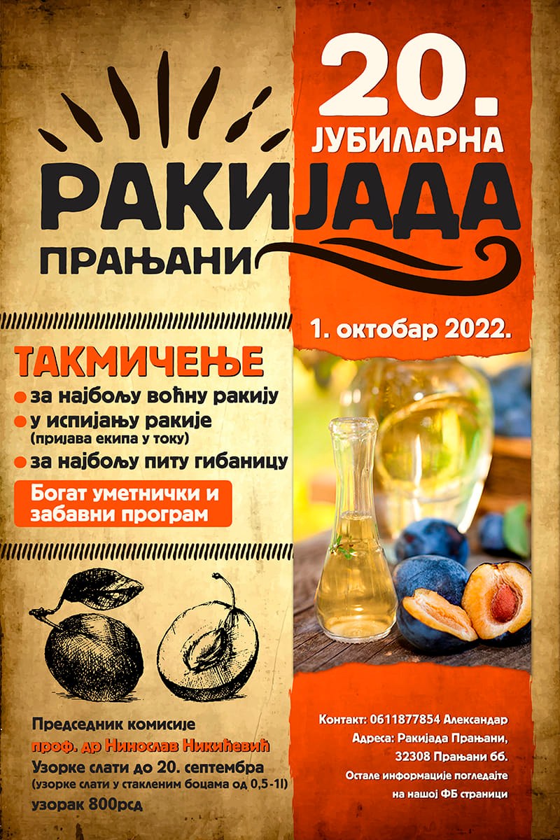 U obzir dolaze sve voćne rakije i biće ocenjene po kategorijama. Broj uzoraka koje jedna osoba može poslati NIJE ograničen!
