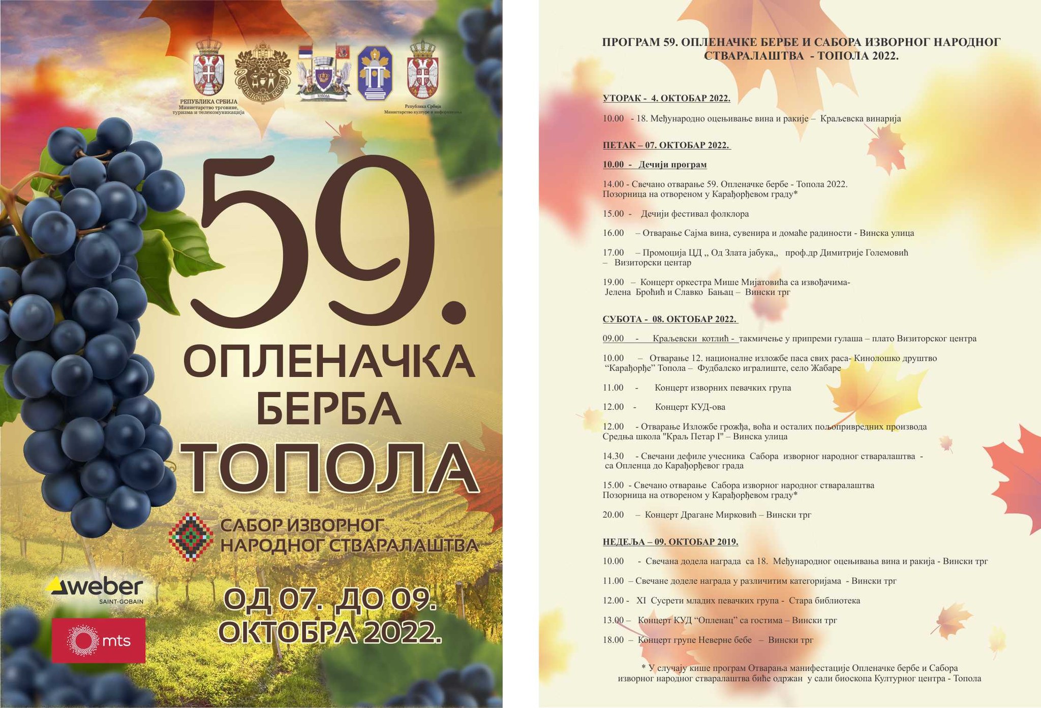 59. Oplanačka berba - Topola od 7. do 9. Oktobra