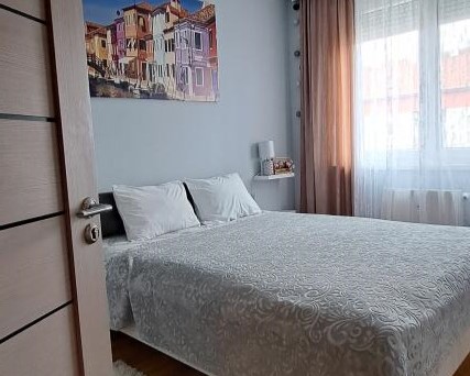 Nov, moderan i kvalitetan stan u novoj zgradi. Poseduje kuhinju, kupatilo, dnevni boravak i spavaću sobu. Poseduje terasu i privatan parking u dvorištu zgrade koje se zaključava. Potpuno je opremljen za duži boravak.