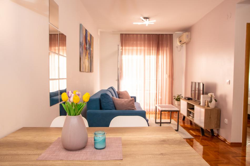 Apartman ima smeštajni kapacitet do 4 odrasle osobe ili 2 odrasle osobe i 2 dece. Sastoji se od spavaće sobe u kojoj se nalazi francuski ležaj, dnevnog boravka u kom se nalazi rasklopivi trosed veličine 160*200, kompletno opremljene kuhinje sa trpezarijom i kupatila sa tuš kabinom i veš mašinom. Karakteriše ga miran ambijent jer terasa gleda na unutrašnjost dvorišta. Za goste koji dolaze sopstvenim prevozom obezbeđen je besplatan, privatan parking u garaži. Na raspolaganju su Vam brzi WiFi internet, kablovska televizija i klima uređaj, kao i oprema za peglanje, fen i sef. Za porodice sa malom decom dostupan je i dečiji krevetac.